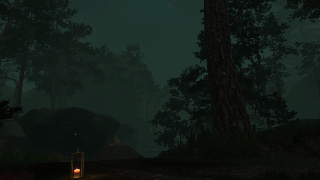 霧がかった松林の中にキャンプ場やキャビンがあるワールド。