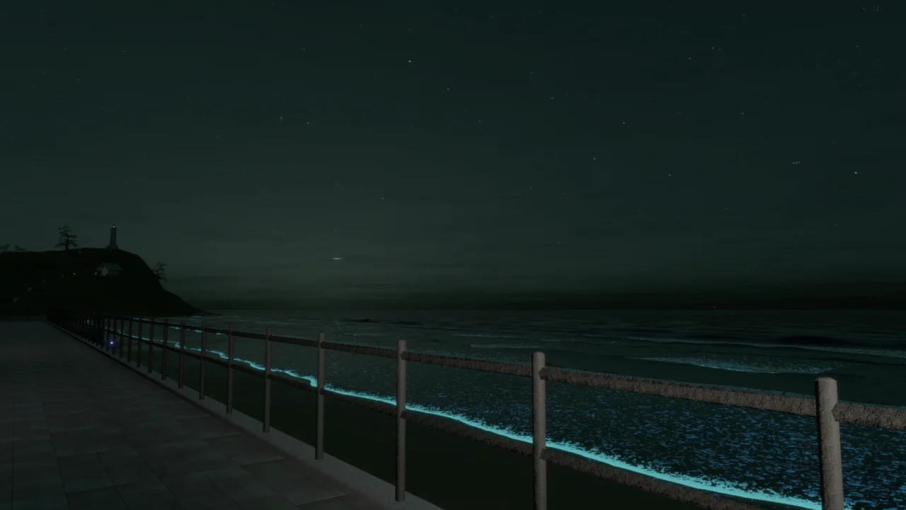 夜のビーチが綺麗なワールド、バス停から灯台の方へとテレポートできる。