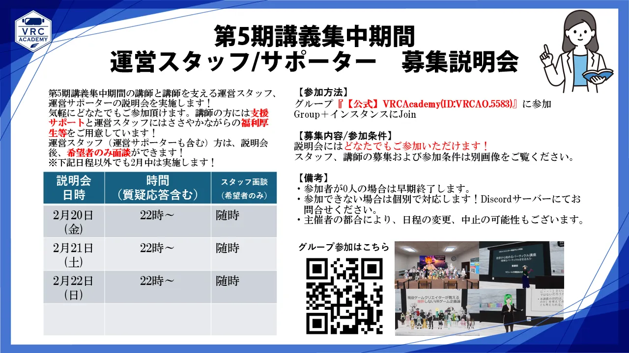 一人ひとりの挑戦と成長を支える学びと交流の学園型イベント『VRCAcademy』の公式グループです!