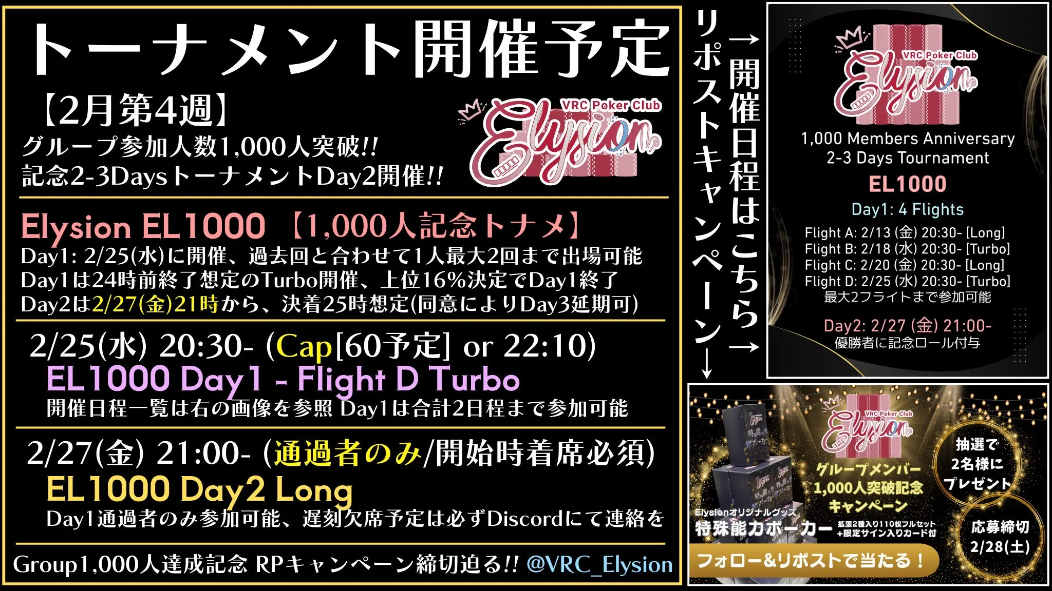 VRC Poker Club Elysionでは、主に水曜日と金曜日を中心に、ポーカーのトーナメント(大会)を開催しています!
