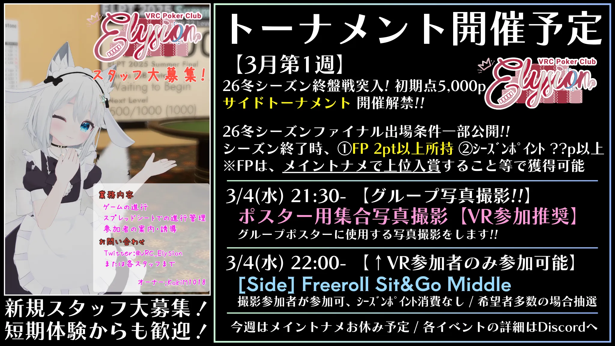 VRC Poker Club Elysionでは、主に水曜日と金曜日を中心に、ポーカーのトーナメント(大会)を開催しています!