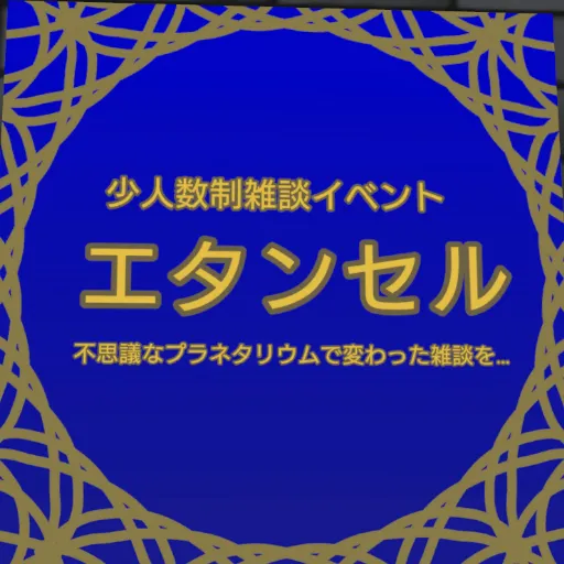 少人数制雑談イベント【エタンセル】 不思議なプラネタリウムで変わった雑談を 【イベント詳細】 時間帯:不定期 (大体の予定日時は告知します) (Xの方が情報が早くて正確です) PCのみ、PCとQuest対応を交互に開催。 イベント受付21˸00〜21˸10⁄イベント開始21˸10〜21˸55⁄軽めのアフターイベント22˸00〜⁄終了次第ゆっくり出来るアフターあります。 受付時間を過ぎる、または満員になれば、インスタンスを閉じます 【参加人数】 定員5名+主催1名 『いらっしゃいませ。 当イベントは不思議なプラネタリウムで普段はあまり考えないような内容を雑談するようなイベントです。 雑談の内容は主に連想ワードを使って決めますので、話す内容が何も出てこないけど話したい方、ミニゲーム感覚で会話の内容を決めますので話すことが苦手な方でも楽しめるイベントとなっております。 また、会話用のペンはございませんのでチャットでやり取りできるのであれば無言勢の方、Quest対応の日でしたQuest単機の方でも参加できますの色んな方々に楽しんでもらえたら嬉しいです。 プラネタリウムと言いましたが本来のものとは全く違いますのでワイワイはしゃいでもでも、静かに会話を楽しむのもお客様次第です。 アフターイベントでは初めての方も、2回目以降の方も楽しめるようなミニイベントを開催します。 お時間に余裕がある方はぜひ。 あとは、注意書きの確認はお忘れなく、必ず手にとってご確認お願いしますね。 それでは、イベントでお会いしましょう』 【雑談内容】 1․サイコロで参加者が選んだ色、参加者の中から一人を主催が選びます。 2․選ばえた色から連想ワードを出してもらいます(イメージ・反対・抽象的・具体的・ぶっ飛んだ答えなど何でも) 3․次の人が先程の連想ワードから連想ワードを出してもらいます 4․最後の人が出した連想ワードから雑談内容のメインを主催が決め、質問・雑談していきます。 これを1サイクルとして21˸50までに話題が止まったと判断しますと2サイクル目を回します。 【軽いイベント説明】 当イベントは時間が来ましたら、または満員になれば インスタンスを閉じますので再入場は不可。 インスタンスに入れましたら、壁に書いてある順番に従って タグから色を選択して下さい (気分、好きな色等自由です。 おまかせ、複数選択okです) 当イベントは写真撮影・X等のSNSに投稿可能です。 (常識の範囲内でお願いします) 床を高くできるコライダーがありますので 小さいアバターでの参加が可能です。 飲食可能です。お酒でもジュースでも、お菓子でもどうぞ。 入った時に渡されるドリンクも ご自由にお飲み下さい。 会話用のペンはございませんのでチャットが出来る方でしたら無言勢でも歓迎します。