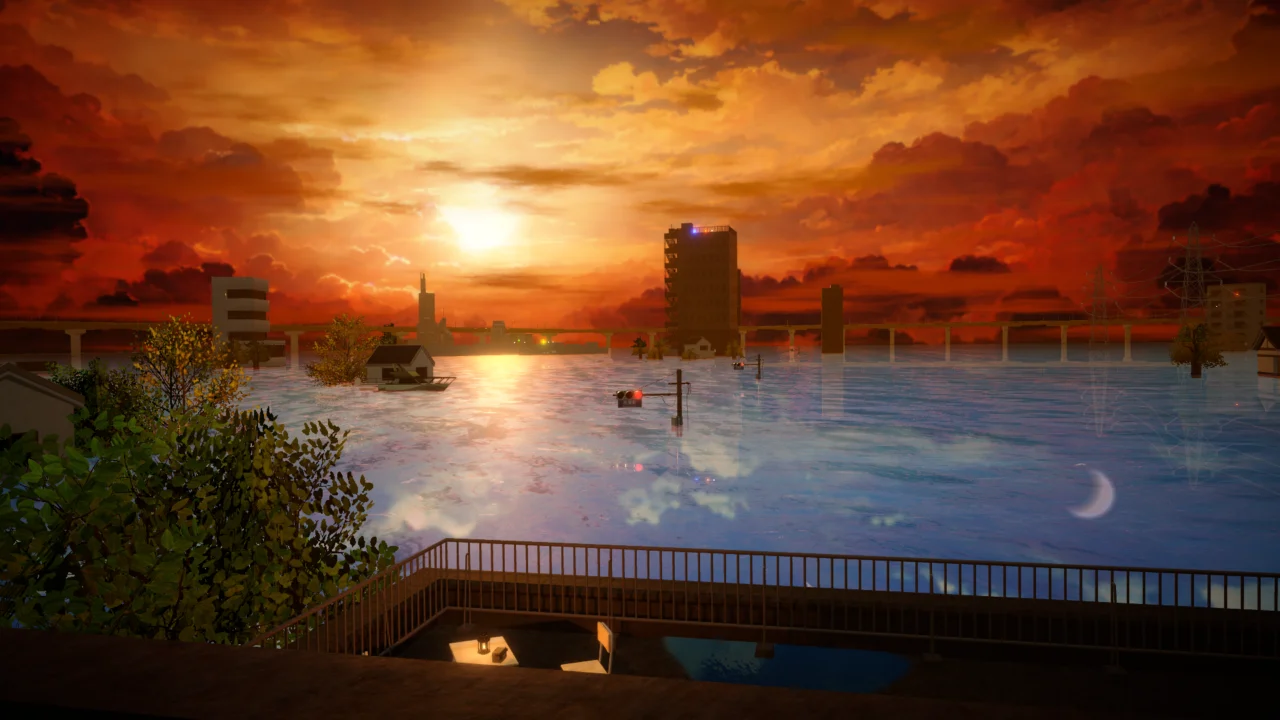 夕焼けで、水に沈んだ街並みが広がるワールド